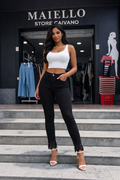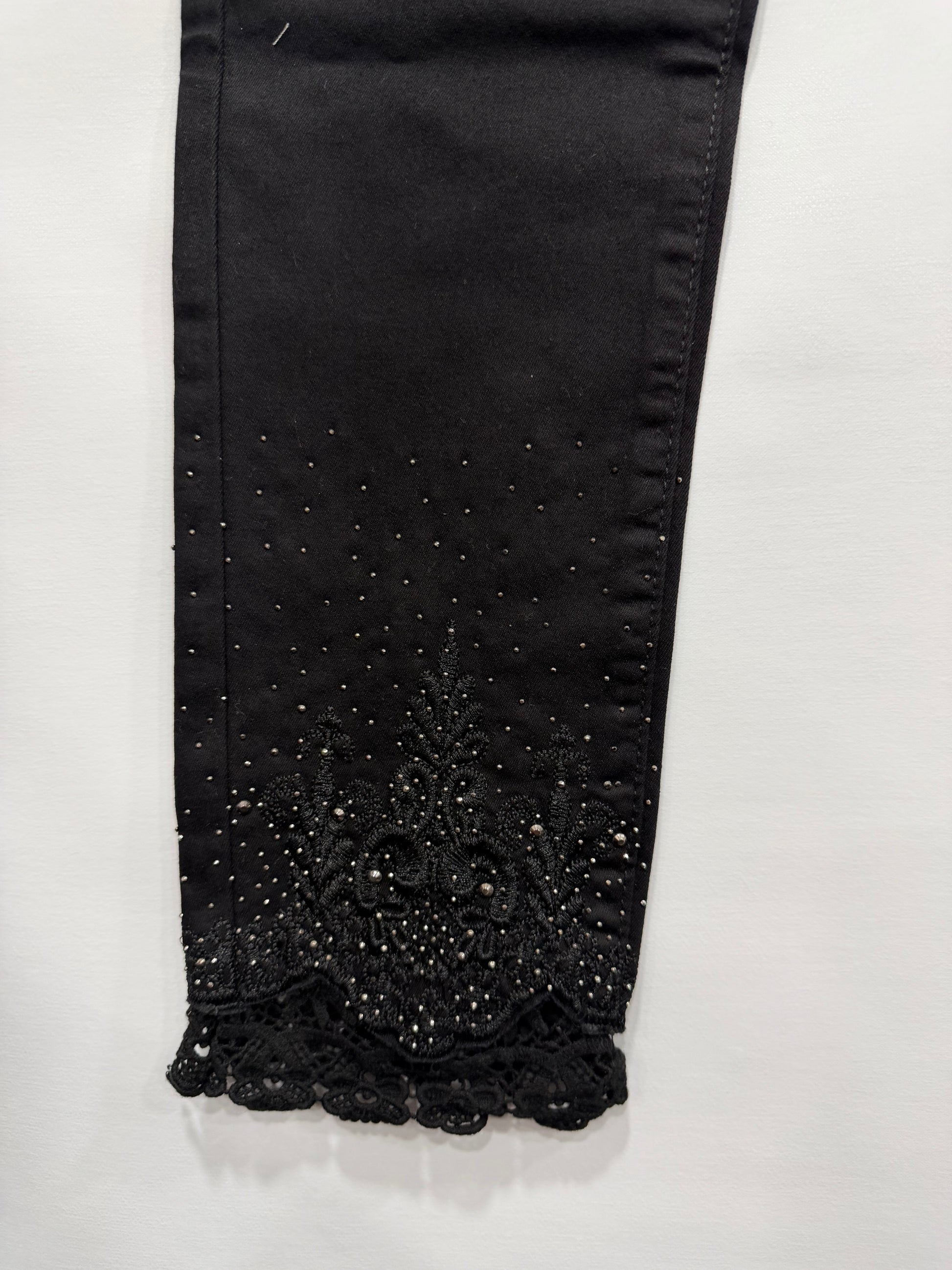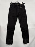 Jeans skinny nero con dettagli in pizzo brillante sulla caviglia. Taglio aderente che valorizza la silhouette, realizzato con tessuto elasticizzato per massimo comfort durante la giornata. Il pizzo brillante sulla caviglia aggiunge un tocco di eleganza e femminilità al capo. Perfetto per creare look sofisticati sia casual che più ricercati. Ideale da abbinare con tacchi o sneaker a seconda dell'occasione.