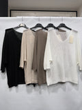 Maglia in filo a scollo V, perfetta per creare look versatili e sofisticati. Il tessuto leggero e traspirante garantisce comfort durante tutto il giorno, mentre il taglio classico si adatta facilmente a qualsiasi occasione, dal casual all'elegante. Ideale da indossare da sola o in abbinamento con altri capi per uno stile personale e raffinato.